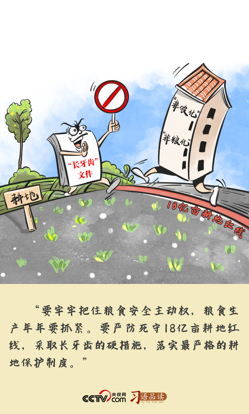 在不到两年的时间内,总书记连续两次用“长牙齿”来巧喻能“咬人”的严格措施,要求保护耕地的措施要够“刚”、够“硬核”,能够真正“咬得疼”违规者,体现出他“但存方寸地,留与子孙耕”的坚定决心和战略定力。
