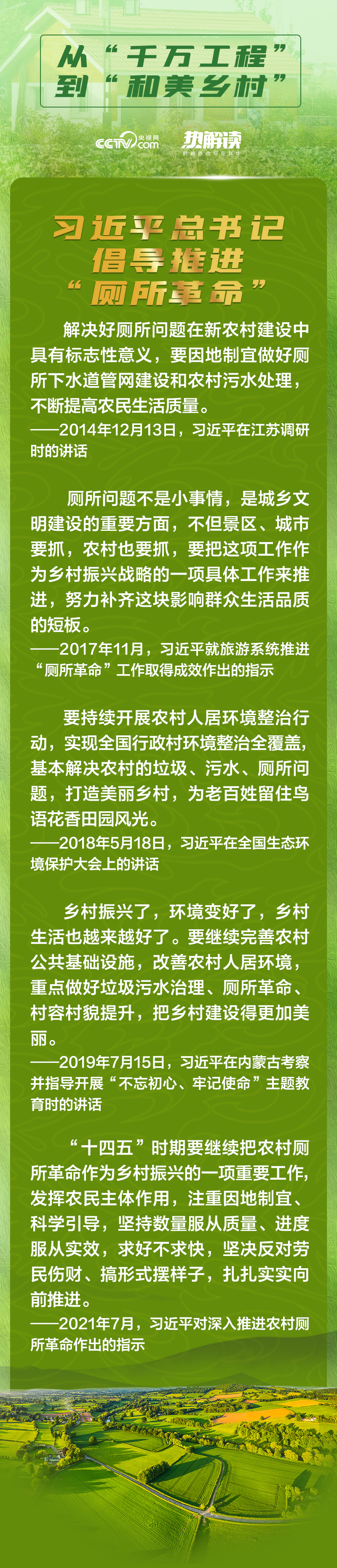 在全国卫生与健康大会上,他充分肯定“厕所革命”的重要意义和成果,提出持续开展城乡环境卫生整洁行动,再次强调要在农村来一场“厕所革命”。