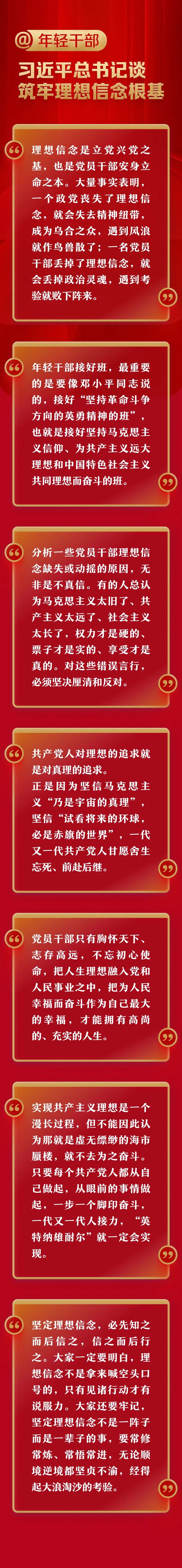 7月1日出版的第13期《求是》杂志刊发习近平总书记重要文章《努力成长为对党和人民忠诚可靠、堪当时代重任的栋梁之才》。在这篇重要文章中,总书记强调:“理想信念是立党兴党之基,也是党员干部安身立命之本”,年轻干部要“筑牢理想信念根基”。