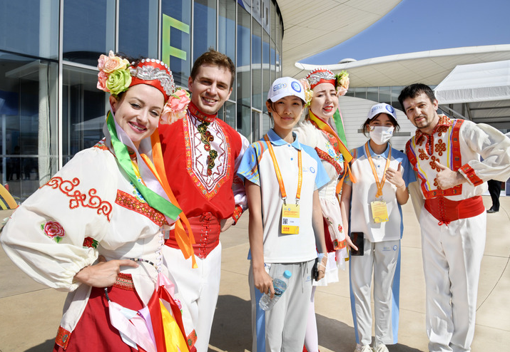 △6月15日,来自白俄罗斯的演员在表演结束后与志愿者合影。当日,上海合作组织产业链供应链论坛暨2023上合国际投资贸易博览会在青岛开幕。