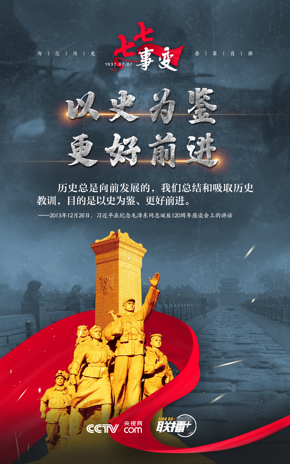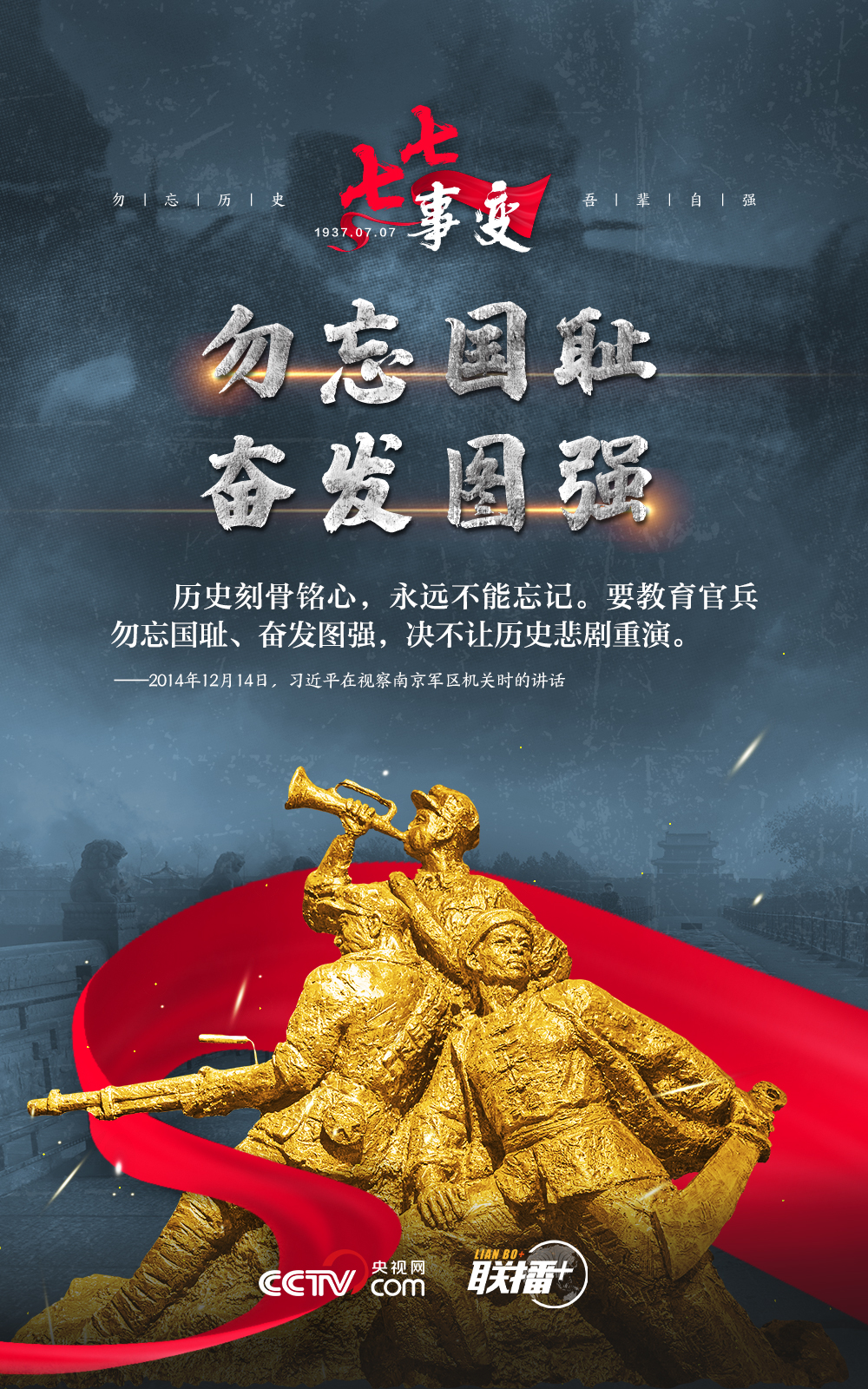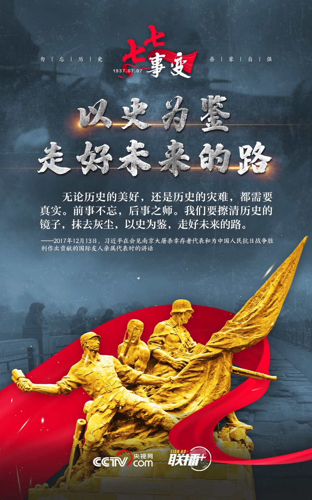 悼念同胞,缅怀先烈。勿忘历史,吾辈自强!在“七七事变”86周年之际,央视网《联播+》栏目特推出海报,与您一起从总书记讲话中汲取自强不息的奋进力量。