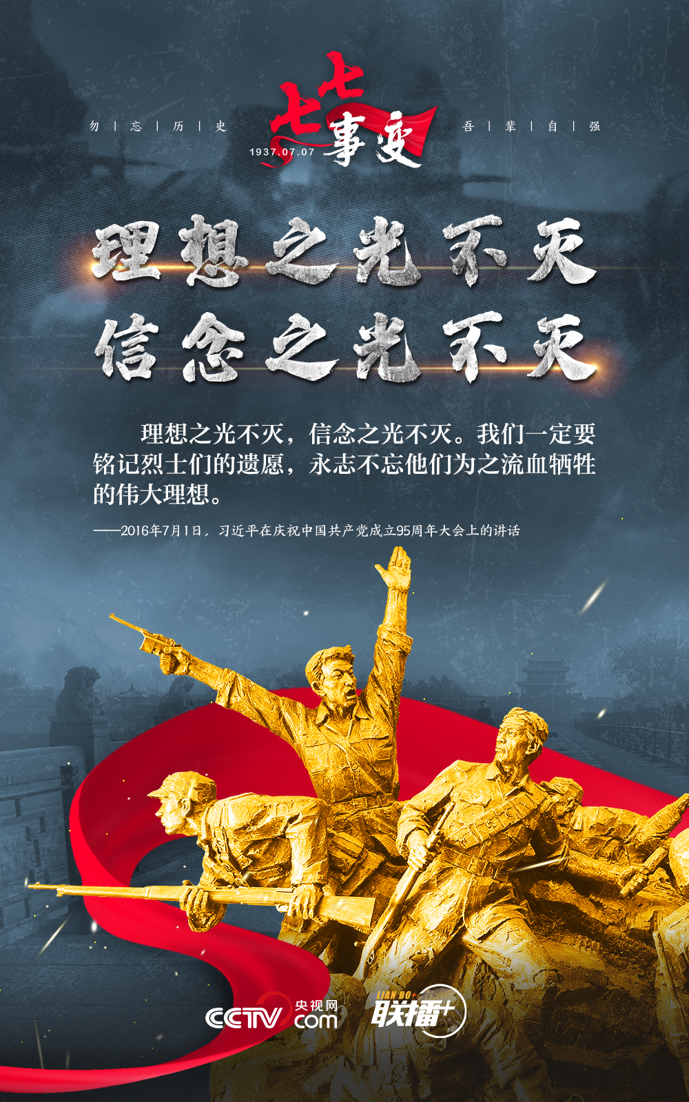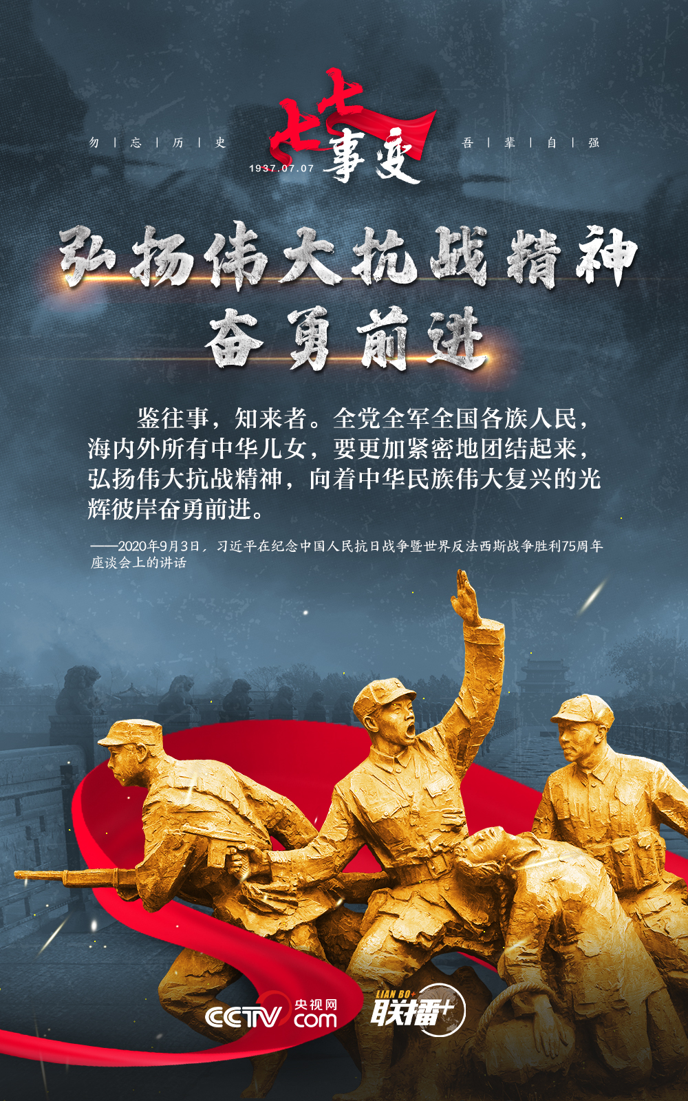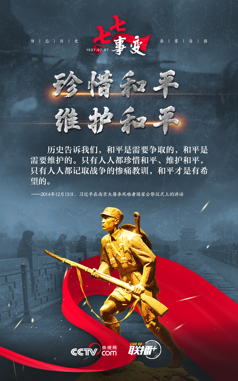悼念同胞,缅怀先烈。勿忘历史,吾辈自强!在“七七事变”86周年之际,央视网《联播+》栏目特推出海报,与您一起从总书记讲话中汲取自强不息的奋进力量。