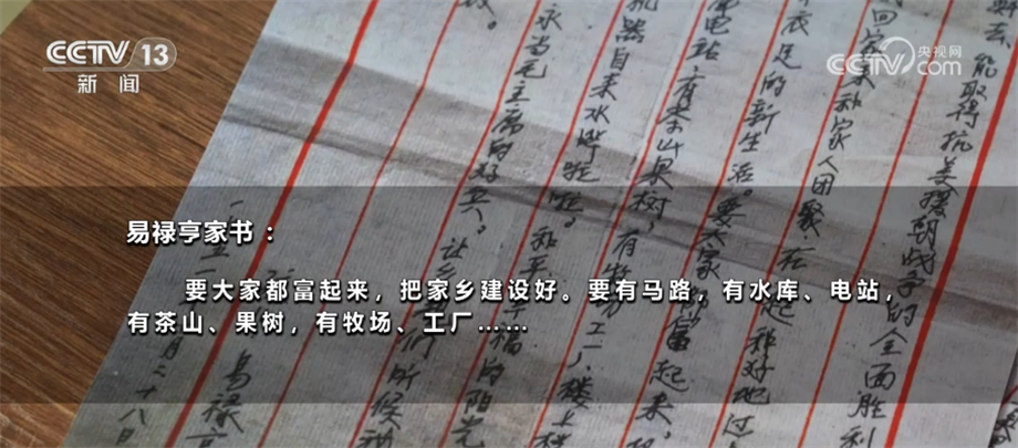 抱着与家人诀别的心情,年轻的易禄亨写下了这封家书。除了战场上的见闻和对家人的思念,他还写下了对未来美好生活的憧憬:要大家都富起来,把家乡建设好。要有马路,有水库、电站,有茶山果树,有牧场、工厂……作为家中长子,瞒着父母走上战场,易禄亨一直心怀愧疚。他希望通过这些文字,能让父母理解自己的决定。