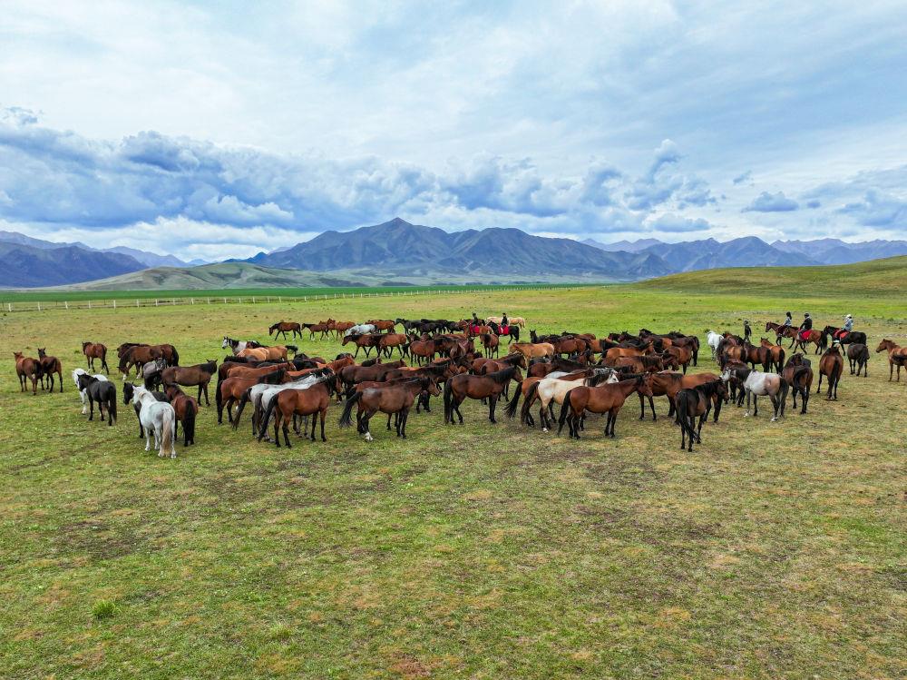 △甘肃山丹马场,成群的骏马在欢腾觅食。