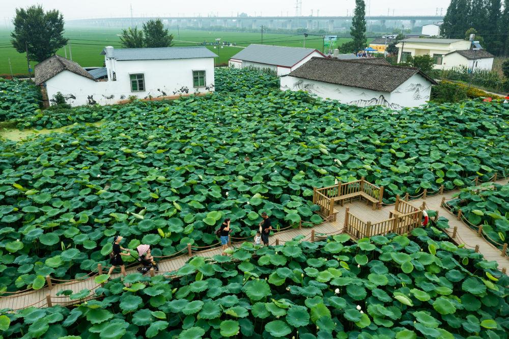 △2022年6月22日,人们在四川眉山市东坡区太和镇永丰村欣赏荷塘美景。