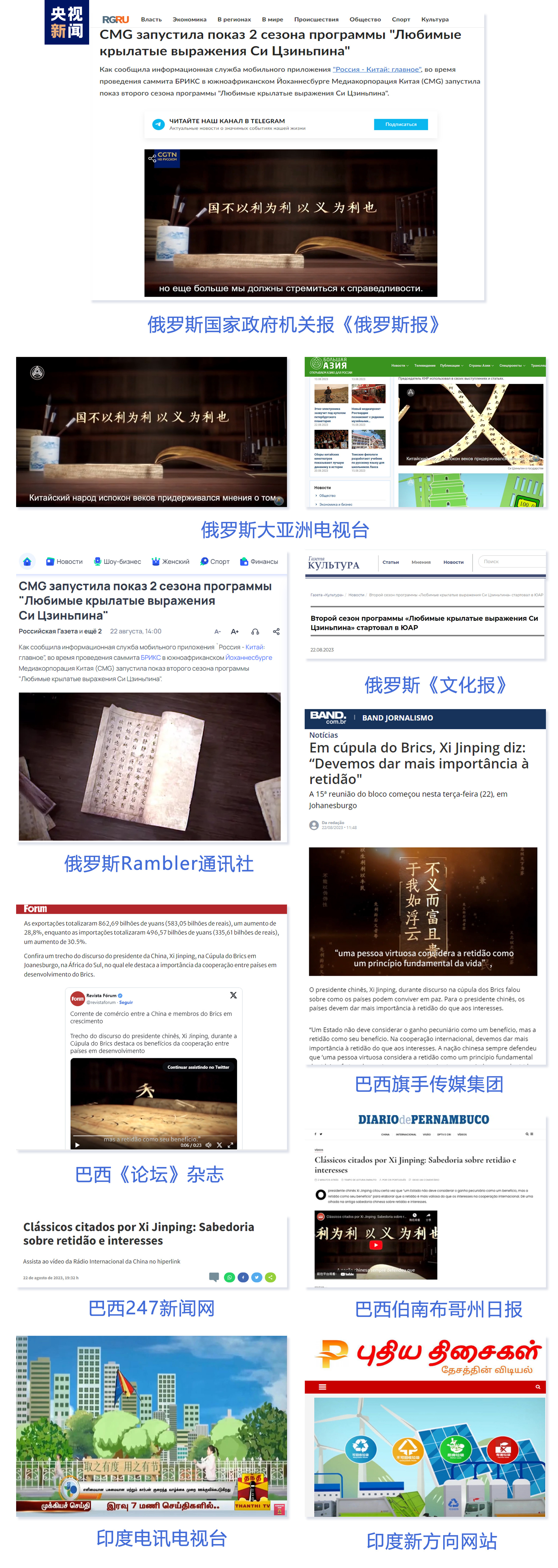 正值金砖国家领导人第十五次会晤在南非举行,《平“语”近人——习近平喜欢的典故》第二季俄语、葡萄牙语、印地语、泰米尔语等版本同步在巴西、俄罗斯、印度等金砖国家落地播出。俄罗斯国家政府机关报《俄罗斯报》、俄罗斯大亚洲电视台、俄罗斯Rambler通讯社、俄罗斯《文化报》、巴西旗手传媒集团、巴西《论坛》杂志、巴西伯南布哥州日报、巴西247新闻网、孟买信使报、印度新方向网站等金砖国家主流媒体纷纷转发转载。
