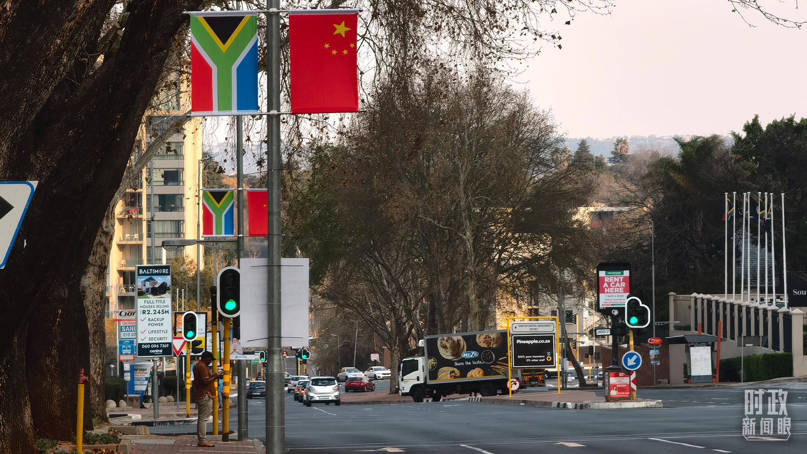 △约翰内斯堡街道两侧悬挂的中国国旗。(总台央视记者韩锐拍摄)