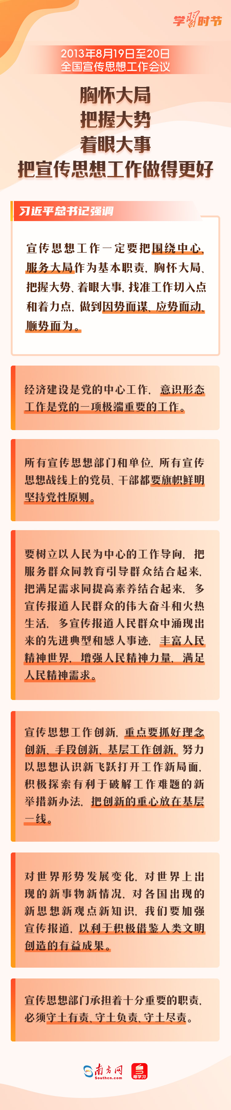 宣传思想文化工作事关党的前途命运,事关国家长治久安,事关民族凝聚力和向心力,是一项极端重要的工作。党的十八大以来,宣传思想文化工作之所以取得历史性成就,最根本就在于有习近平总书记领航掌舵,有习近平新时代中国特色社会主义思想科学指引。让我们一同回顾刚刚召开的全国宣传思想文化工作会议,以及2018年、2013年召开的两次全国宣传思想工作会议,看看总书记通过这三次会议,为宣传思想文化工作划出了哪些重点。