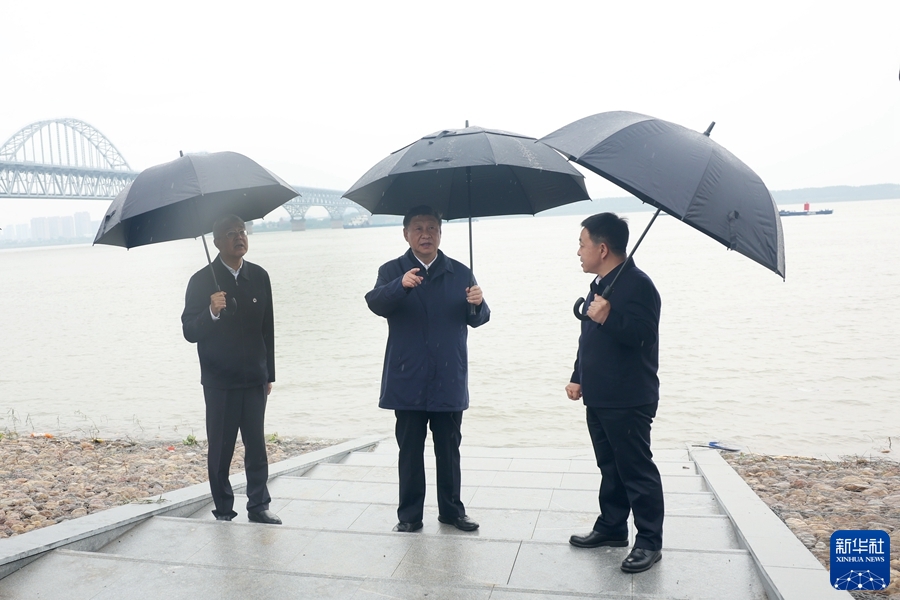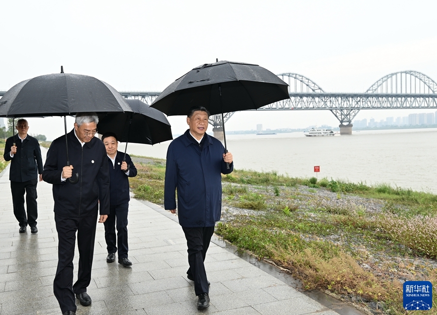 10月10日至13日,中共中央总书记、国家主席、中央军委主席习近平在江西考察。这是10日下午,习近平在长江国家文化公园九江城区段考察时,冒雨沿江堤步行察看沿岸风貌。