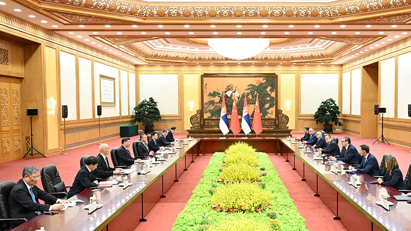 习近平指出,塞尔维亚是中国的铁杆朋友,两国关系经受住国际风云变幻考验,堪称中国同欧洲国家友好关系的典范。两国在基础设施建设、产能等领域合作成果丰硕,务实合作的深度和广度不断拓展,质量和效益持续提升。去年2月我们就开通中塞直航、商签双边自由贸易协定达成的重要共识已经得到落实,必将为新时代中塞关系发展注入新动能。