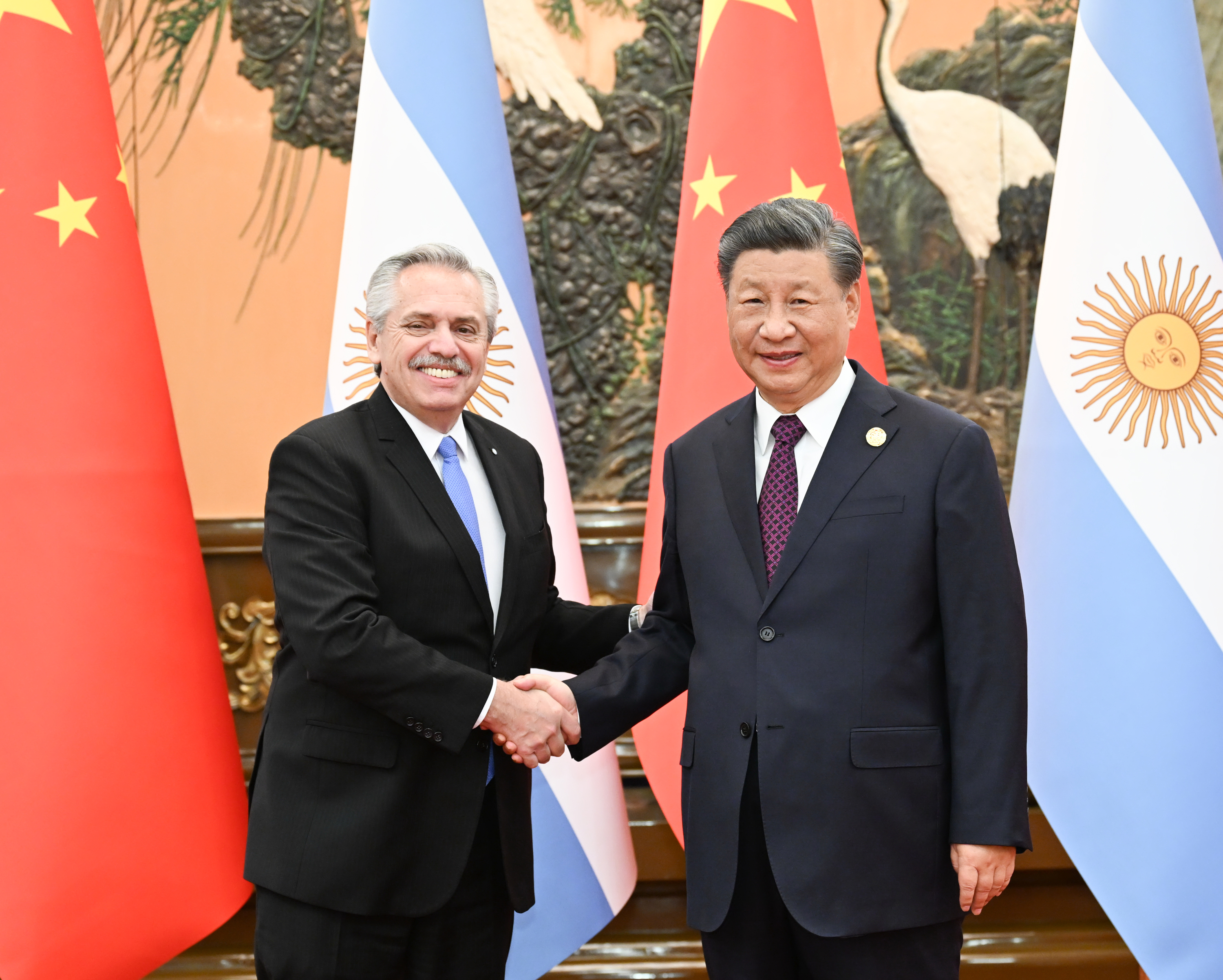习近平祝贺阿根廷获邀加入金砖国家合作机制,指出中阿要在联合国、二十国集团、金砖合作机制等框架内加强战略协调,推进落实全球发展倡议、全球安全倡议、全球文明倡议,推动构建人类命运共同体。中方一贯支持拉美和加勒比地区一体化进程,愿同阿根廷和其他拉美和加勒比国家一道,推动中拉论坛建设和中拉关系发展。