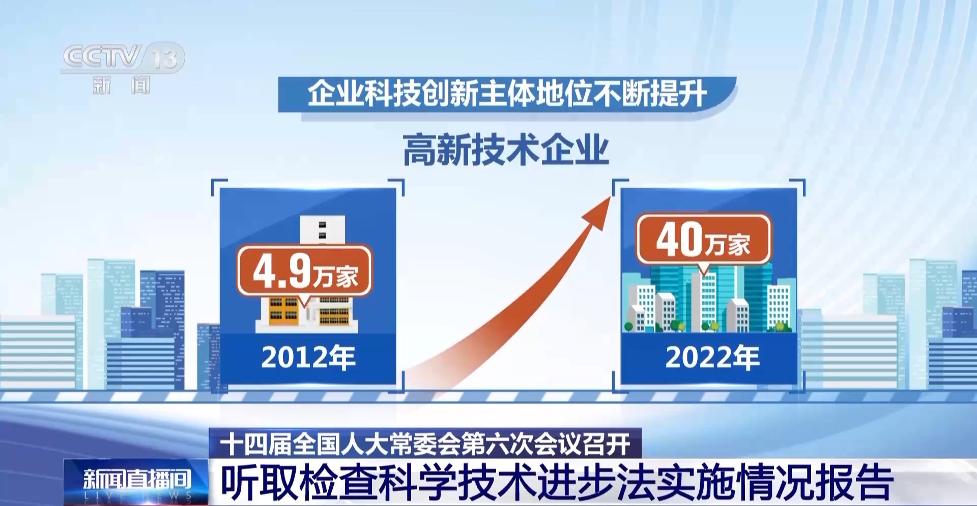 报告显示,企业科技创新主体地位不断提升。2012年至2022年,高新技术企业从4.9万家增长到40万家,全国技术合同成交额从0.64万亿元增长到4.8万亿元。企业研发投入占全社会研发投入比重达到77.6%,国家重点研发计划中企业参加或牵头的接近80%,在油气开发、集成电路装备重大专项中企业牵头任务比例达到85%以上。