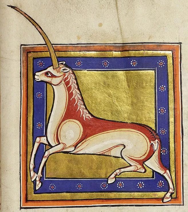 独角兽这一神秘野兽形象最初现于老普利尼(Pliny the Elder)的《博物史》(Natural History)中,被描述为一种头似牡鹿、尾如野猪、象脚马身,且头部带有4英尺长角的生物。图自《亚伯丁动物寓言集》(Aberdeen Bestiary),1200年左右为英国人写就并插图。