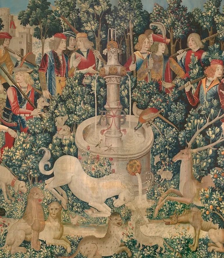 第二张独角兽挂毯画。画上的独角兽正将具有净化功能的角浸入水中,周围站着一群谈话的猎人。? metmuseum
