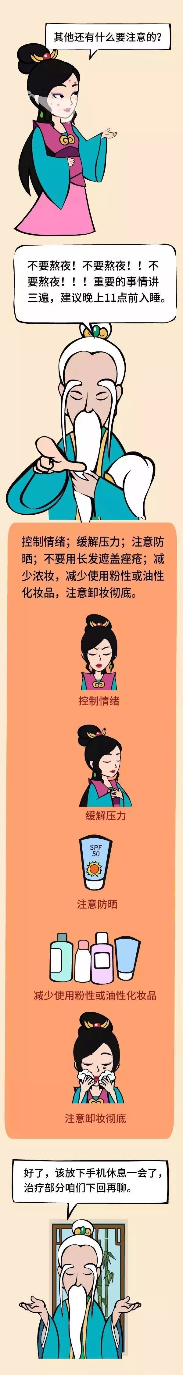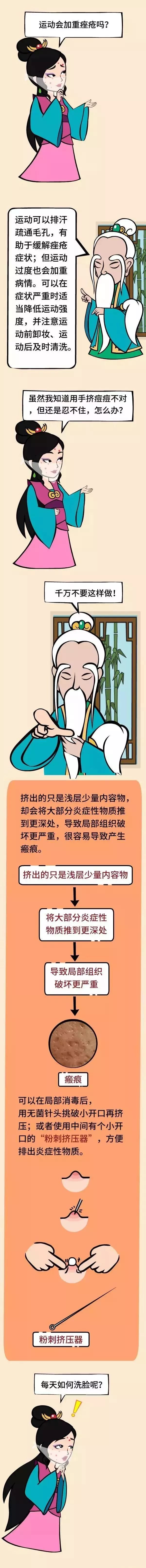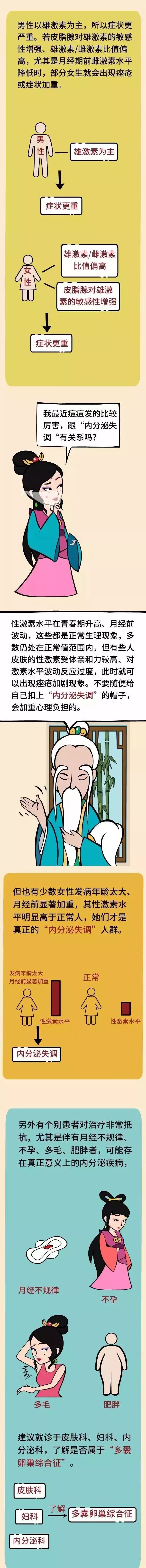 “痤疮”总结: 1、这是青春期的慢性病,可能要打持久战。 2、发病与“雄激素”水平及受体敏感性密切相关。 3、女性也会产生雄激素,发病也与雄激素有关。 4、月经前症状加重属于正常现象,与雌激素水平周期性降低有关。 5、多数人性激素水平正常。发病与身体对激素水平波动反应过度有关。 6、发病年龄太大、月经前显著加重,可能存在“内分泌失调”问题。 7、严重痤疮伴月经不规律、不孕、多毛、肥胖,当心“多囊卵巢综合征”。 8、适度运动、运动前卸妆、运动后及时清洗,有助于减轻痤疮症状。 9、清洁、控油有助缓解痤疮症状。每天洗脸2-3次,水温27℃左右。 10、挤压会扩大损伤,容易产生瘢痕。可采用“粉刺挤压器”排出炎症性物质。 11、饮食无绝对禁忌,适度即可。多摄入水果、富含纤维素的蔬菜。 12、不熬夜,晚上11点前入睡,对于控制痤疮非常重要!