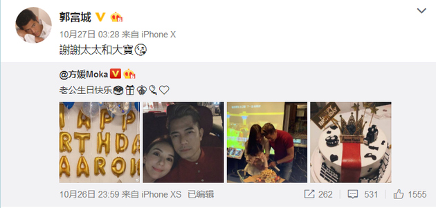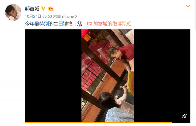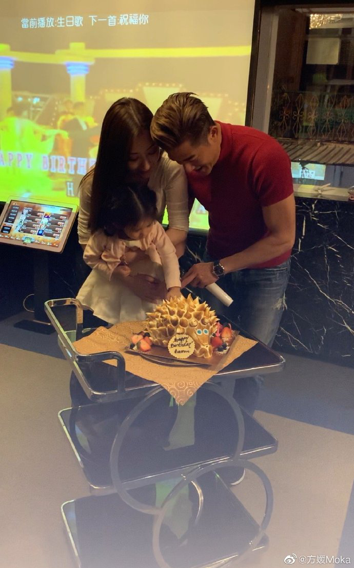 网易娱乐 10 月 28 日报道北京时间 10 月 28 日消息,据香港媒体报导,郭富城(城城)与老婆方媛育有两个女儿,前天(10 月 26 日)是郭富城 54 岁生日,他晚上在社交网上载视频,两岁大女 Chantelle 为他唱生日歌。片中 Chantelle 拿着咪用普通话唱了两句"祝你生日快乐",在旁的郭富城笑得很开心,捉着女儿小手,父女情深,郭富城向女儿说"谢谢",画面温馨又有爱。郭富城甜蜜留言:"今年最特别的生日礼物。"方媛也有分享这段视频表示:"一早起来就用各种方式祝爸爸生日快乐了。"方媛分享抱着 Chantelle 与郭富城在蛋糕前的照片,还有跟郭富城的甜蜜合照,祝贺"老公生日快乐!"他回复说:"谢谢太太和大宝!"