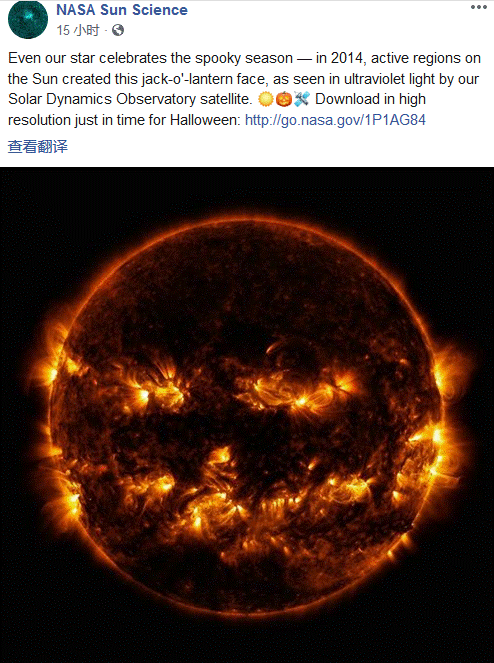 CNN说,由于外观酷似一盏巨大的燃烧着的南瓜灯,连NASA都忍不住在脸书上喊话网友说,正好赶上万圣节,还不赶紧下载一张高分辨率的太阳“南瓜灯”照片?↓