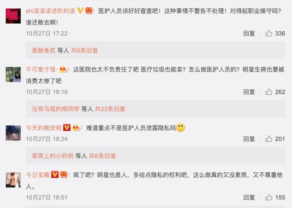 大量网友质疑医院泄露个人隐私、违规处理医疗垃圾。纷纷表示 “这样的医护人员一点职业道德都没有”“明星生病也要被消费也太惨了吧”“这么做真的又没素质,又不尊重他人”......