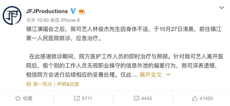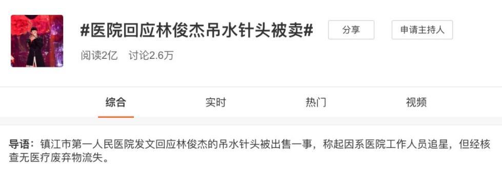 10月26日晚,歌手林俊杰在江苏镇江市举办了演唱会。27日晚,@林俊杰国际歌友会 发博称,林俊杰在结束演唱会后因身体不适,前往镇江第一人民医院就诊。随后,有人在网络上爆料称,林俊杰就医信息被泄露,“林俊杰的吊水针头被出售”话题引爆网络。28日凌晨,涉事医院回应此事,并登上了微博热搜榜。28日上午,林俊杰经纪公司也作出回应......