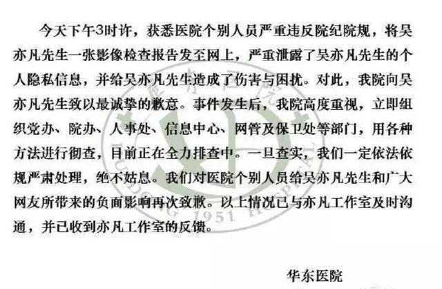 2016年,吴亦凡因拍摄《西游伏妖篇》吊威亚四个月导致腰伤严重,在上海一家医院就医,被该院人员泄漏了因腰伤在医院做磁共振检查的照片……事后该医院发博向他道歉,表示会对相关人员进行严肃处理,绝不姑息。