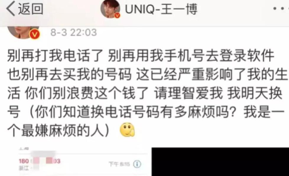 今年8月,演员王一博就在微博上怒斥了自己被粉丝疯狂骚扰的行为,王一博发博称,自己的电话号码遭到泄露,不仅被买卖,还被拿去登陆软件,这种行为给自己带来很大麻烦,严重影响了个人生活。不仅如此,王一博还晒出了电话记录截图,里面竟然有高达194个未接电话。