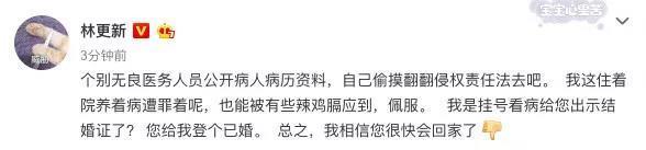 2018年8月,林更新在北京某医院就诊时,曾被医务人员公开病历资料,并因将未婚身份擅自登记为“已婚”,遭到林更新在微博上的谴责。
