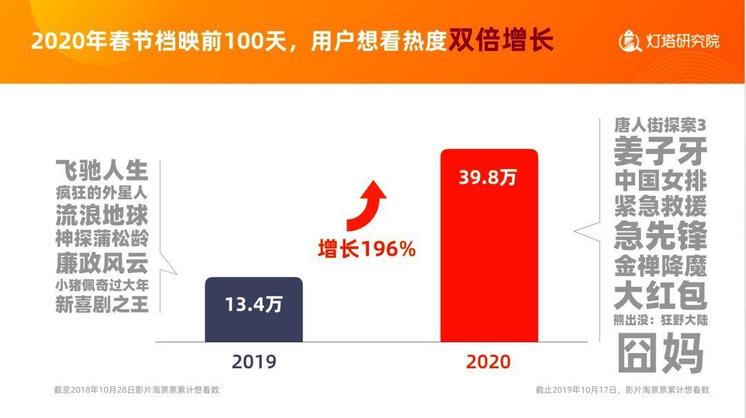 “史上最强国庆档”的诞生,也产生了连带效应,让2020年春节档的重点影片提前进入观众视野。《唐人街探案3》《中国女排》《姜子牙》《紧急救援》等多部影片,都以“贴片”的形式成功蹭上了国庆档的热度。据统计,在距离春节档还有100天时,淘票票用户对几部影片的想看热度已达到39.8万,较去年增长了近200%。