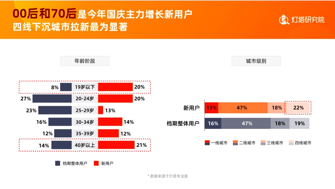 今年国庆档适逢新中国成立70周年,在《我和我的祖国》、《中国机长》和《攀登者》等主旋律影片的强势带动下,8天内票房突破了50亿元大关。灯塔研究院院长牧晨分享了这背后出现的一些行业新趋势,比如:档期内购票观影用户中,女性占比较去年增长显著,提升了7个百分点;00后和70后成为了今年国庆档新用户的增长主力,19岁以下、40岁以上的新用户占比都超过了20%;同时,四线下沉城市的“拉新”最为显著,而“唤醒用户”则集中在95后,一二线城市的存量用户也开始在今年国庆档更多地购票观影。