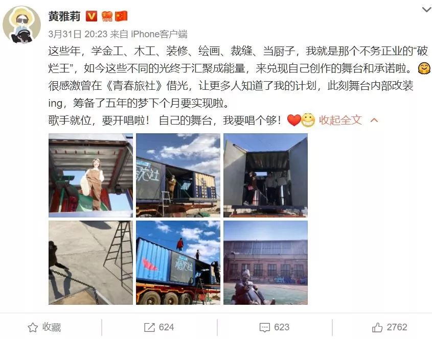 这个舞台的第一次使用,是在综艺《青春旅社》的结业表演上,这也是黄雅莉第一次在自己的集装箱舞台上表演。