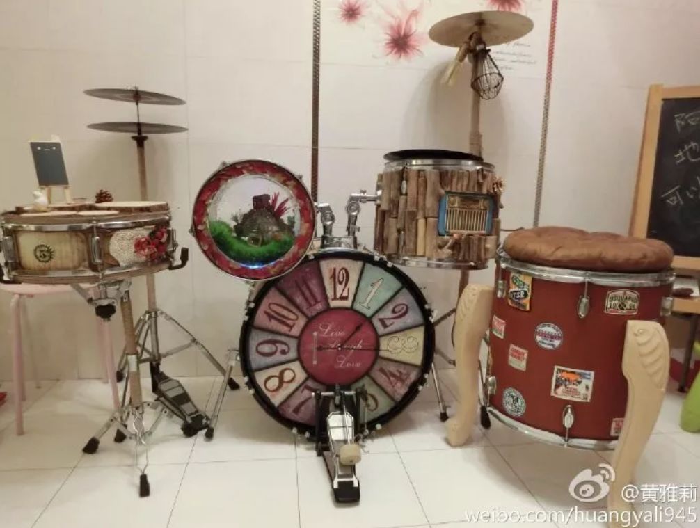 家里闲置了一套架子鼓,她就改装成时钟、沙发、鱼缸、黑胶唱片机、桌子、唱片架和吊灯。