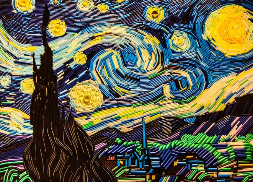 黄雅莉《朤》Lǎng 《新华字典》注释:古同“朗”。晴朗,没有乌云遮盖的天空中出现星与月亮。临摹梵高作品 材料:吸管、瓶盖