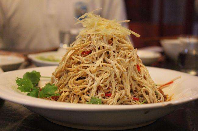 喝茶配“茶菜”,首选 “烫干丝”。汪曾祺说,“干丝不是下饭的,是佐茶的”,听上去似乎有点红茶配西点的感觉。只不过干丝吃起来可不能讲究姿态,一根根细嚼慢咽尝不出它的真滋味,烫干丝的正确吃法是夹起一大簇,带着酱汁一起入口,这时候来一口茶水,干丝的细腻口感中和了茶叶的苦涩,人生的高光时刻,大概也就如此了。