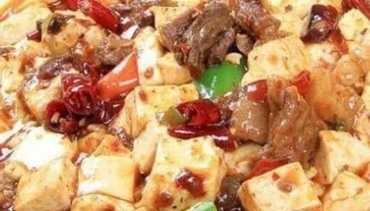 材料:豆腐400克、牛肉200克、小红椒2个、香菜适量、红油豆瓣酱适量、姜2片、蒜一瓣、葱一段、盐适量、鸡精适量、料酒适量