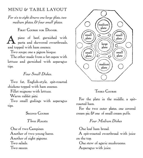 17世纪另一本法餐烹饪名作除了给皇室和布尔乔亚开创出如焦糖布丁这样的法餐标准菜谱,还贴心地附上餐桌的摆台,上菜的顺序。
