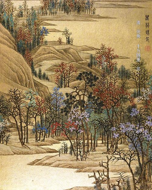 "《十万图册》是任熊晚年创作的10幅山水精品,以“十”、“万”来概括天下美景与赏心乐事。其中万林秋色生动描绘了斑斓多彩的秋日山林,艺术效果浓艳华贵而不失雅逸。"