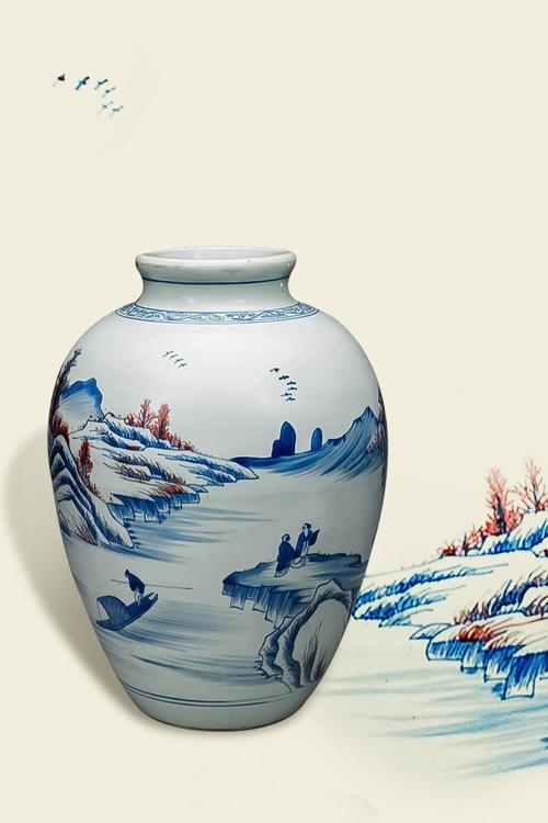 清·青花釉里红山水图罐
