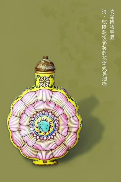 "鼻烟壶为扁圆体,椭圆形圈足,壶身施黄釉,环饰花草纹,腹部绘大朵木芙蓉花,造型灵巧生动,淡粉色调柔和清丽。整体艺术风格富丽堂皇又不失典雅。"