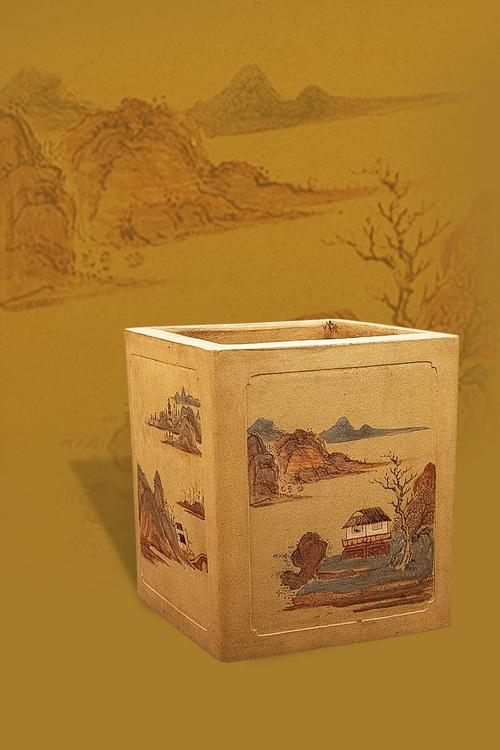 清·宜兴窑紫砂彩画山水图方笔筒