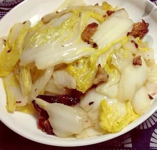 3、加入猪油渣,下入控干水切好的白菜,大火快速翻炒至白菜断生。