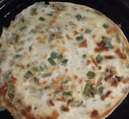4、锅烧热,少加一点油,把饼扔进去,小火煎止两面金黄。