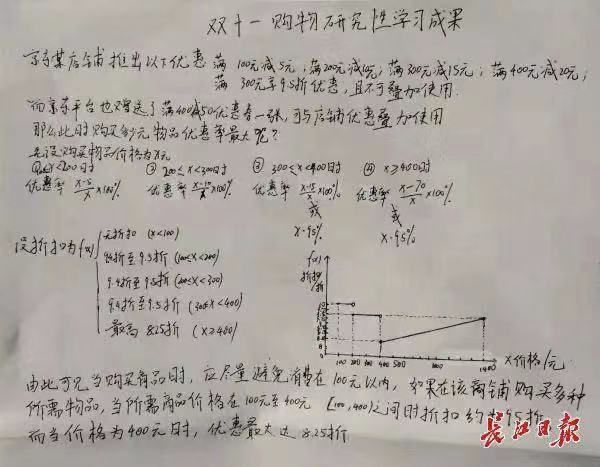 给学生布置这项作业的武钢三中数学老师王小宁表示,2019年的高考试卷中有大量取材于现实生活中的材料,要求学生会用数学的眼光观察世界、思考世界、表现世界。“双11”商家的各种优惠制度五花八门,正是学生体验数学在生活中应用的大好时机。