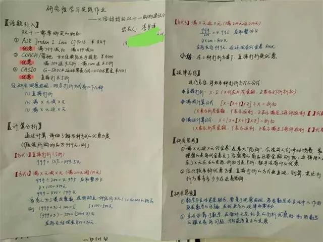 “这份给妈妈的‘双11’购物策划案花了我3个小时,我非常享受做这样的作业。把我所学的函数知识应用到‘双11’,太接地气了!”高一(3)班学生金灿告诉记者,她给妈妈购物车里的百褶裙、手提包和羊毛围巾3件商品做了详细的购物方案,利用组合优惠方式,帮妈妈节省了几百元。