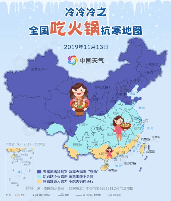 13日开始,许多地方气温就顶不住了,冷到怀疑人生。像是长春、沈阳、呼和浩特、北京、石家庄等地,相比12日,今天最高温跌幅均在11℃以上,哈尔滨、长春、呼和浩特全面降温到冰点以下,从秋阳暖暖局面直接跌入“冰窖”,再加上大风肆虐,体感是嘎嘎冷,说抱着火锅跑也不为过,急需火锅来“续命”,东北多地还将飘雪,下雪天吃火锅简直是绝配;江南、黄淮、西南一带今天则有“透心凉”的赶脚,宜约上三五好友组团吃火锅,以免冷到发抖,来顿火锅可让体不寒。