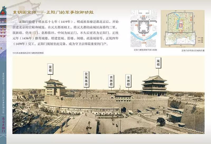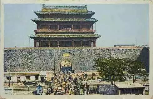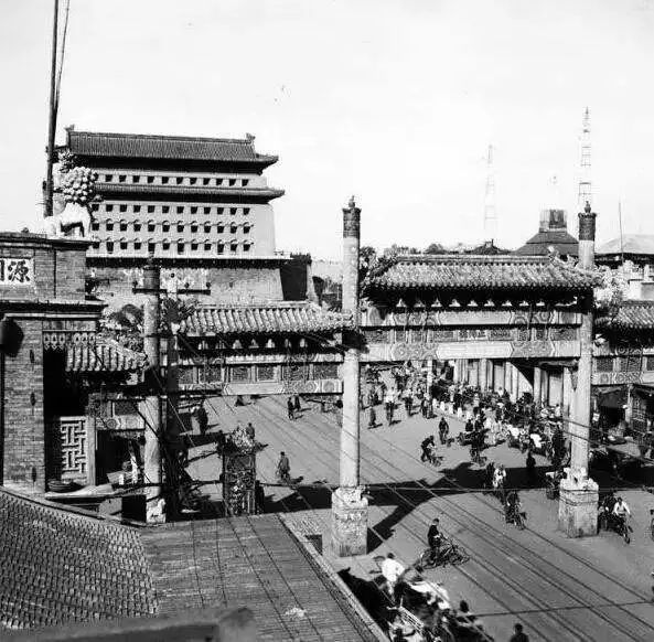 当时一些爱国的实业家,为了振兴民族经济,组织全国各地出产的名、特产品参加国货陈列所的展览和销售。国货的展出轰动了北平,一时在北平传颂着:“前门箭楼看国货,货物琳琅品种多;福建雕漆放异彩,北平珐琅名显赫;湘蜀刺绣花样好,苏杭丝绸人争购;铁锅最讲三道线,广东束鹿声价高;南剪张小泉为王,北剪王麻子是首;江南花布纤维细,河北土布粗又厚。” 1935年6月,该馆发布提倡国货口号,并在前门地区广为宣传。其主要口号有:“学生要做提倡国货的领导者!妇女要做提倡国货的先锋队!商人要做提倡国货的拱卫军!”“是中国人就要爱中国货!不爱本国货便是亡国奴!”“国货陈列馆可使生产者有以观摩!国货陈列馆可使消费者知所采购!” 1940年代,警察局、电影院 在日伪统治时期,正阳门箭楼被辟为电影院,日本无条件投降后,箭楼电影院停演。1946年“北平市立第二民众教育馆”在箭楼重张电影事业,直至1947年。 前门外大街两侧,是阛阓的聚集区。有关清末前门外商业街市的兴旺景象,有很多记载。如《庚子纪事》提到:“凡天下各国,中华各省,金银珠宝、古玩玉器、绸缎估衣、钟表玩物、饭庄饭馆、烟馆戏园,无不毕集其中。京师之精华,尽在于此;热闹繁华,亦莫过于此。”《都门纪略》也说:“京师最尚繁华,市廛铺户,妆饰富甲天下,如大栅栏、珠宝市、西河沿、琉璃厂之银楼、缎号,以及茶叶铺、靴铺,皆雕梁画栋、金碧辉煌,令人目迷五色。至肉市、酒楼饭馆,张灯列烛,猜拳行令,夜夜元宵,非他处所可及也。”《朝市丛载》记载大栅栏:“画楼林立望重重,金碧辉煌瑞气浓。”