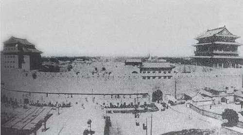 1900年,两遭劫难 正阳门因其位于紫禁城的正前方,又有“前门”之称。近代以来,正阳门历经劫难。清道光二十九年(1849年),正阳门箭楼失火。当时,正值第一次鸦片战争后的第九年,朝廷国库空虚,财力紧张。修缮正阳门箭楼所需的三丈四尺多长的大柁,都无力筹办。后来把西郊畅春园中九经三事殿中的大梁拆下挪用,才把箭楼修复。同治五年(1866年),瓮城东门洞千斤闸又自燃失火。而最大的一次火灾,在光绪二十六年(1900年)的庚子之变时。 这一年,北京城内的义和团运动如火如荼,在“扶清灭洋”的口号下,义和团对在北京的外国使馆、教堂、商号等进行了全面的围攻。庚子年五月二十(6月16日),义和团在前门一带查禁洋货,并放火焚烧了前门外老德记大药房。这一把火,不仅烧了大栅栏这一条街,而且殃及观音寺、珠宝市、前门外大街及正阳门箭楼。箭楼在这次火灾中遭到严重损毁。还不到两个月,正阳门箭楼又遭劫难——八国联军攻入北京外城后,在天坛架设大炮向正阳门等处狂轰,箭楼再遭重创,这座北京城的门面建筑被炸得惨不忍睹,城台以上部分尽毁。