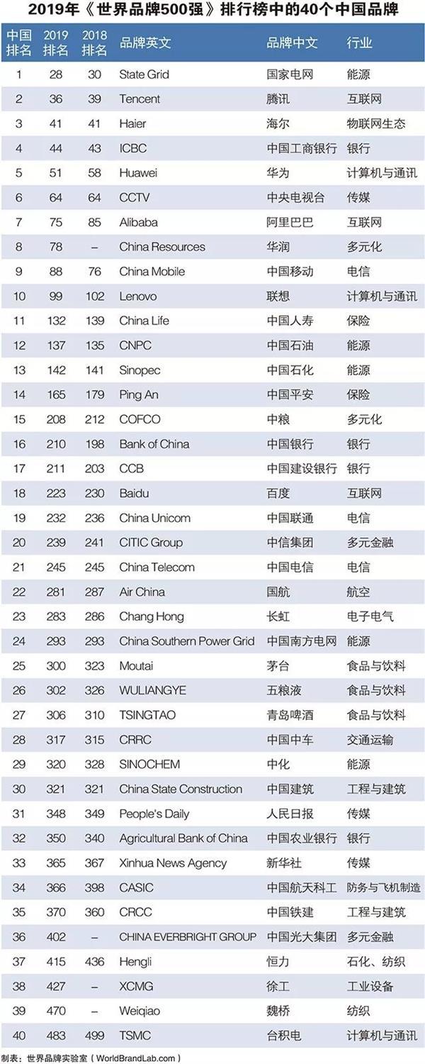 入榜的中国品牌前十包括:国家电网(28名)、腾讯(36名)、海尔(41名)、中国工商银行(44名)、华为(51名)、中央电视台(64名)、阿里巴巴(75名)、华润(78名)、中国移动(88名)、联想(99名)。