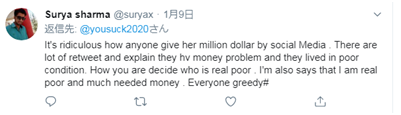 “有人通过社交媒体给别人一百万,这太荒谬了。有很多人转发说他们需要钱,他们的生活条件很差。但你是如何决定谁是真正的穷人?我还说我很穷呢,我也非常需要钱。人性都是贪婪的。”