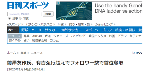 据《日刊体育》14日报道,今天(14日),日本时尚电商Zozo创始人前泽友作的推特粉丝数量达到719.9万,已超越日本著名搞笑艺人有吉弘行(粉丝数719.3万),成为日本推特粉丝数量最多的博主。