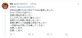 “为了这份福利,我第一次注册了推特。我想逃离无法忍受的丈夫,我想还清巨额债务,我想和三个孩子幸福地生活,我想报答我添了很多麻烦的父母,我想帮父母开个小店。我需要您的帮助。拜托您了,拜托您了。”