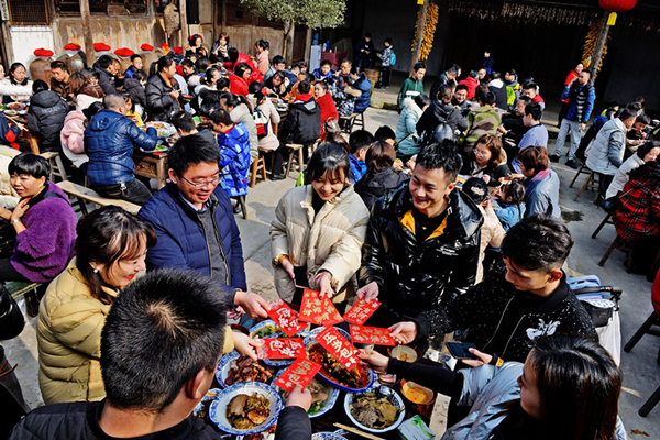 小年到来,四川省德阳市旌阳区双东镇龙洞村摆起“坝坝宴”,左邻右舍齐聚一堂,互发红包、彼此祝福,共庆丰收、喜迎新春。(四川省德阳市旌阳区纪委监委供 曾颖 摄)